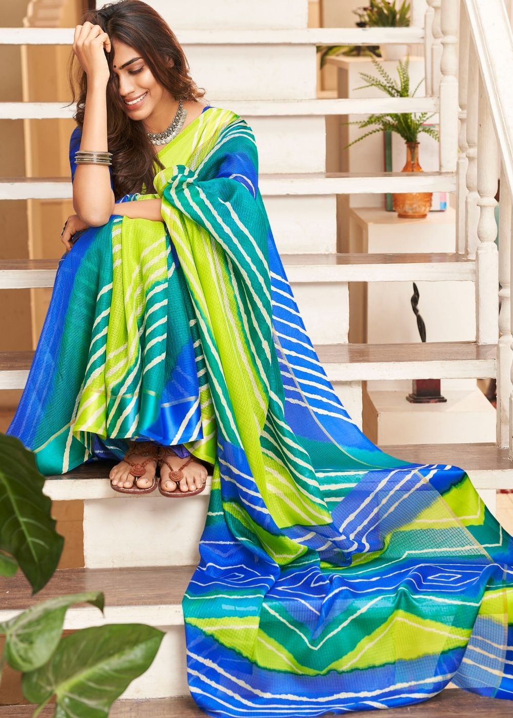 The softness of cotton is unmatched and if comfort is your priority, there is no looking beyond these. Leheriya print cotton sarees are the most contemporary designs owing to their alluring craftsmanship. This dazzling beauty in hues of flamingo pink blends of blue and yellow comes embellished with an assorted ensemble of stripes to give it a sassy appeal.