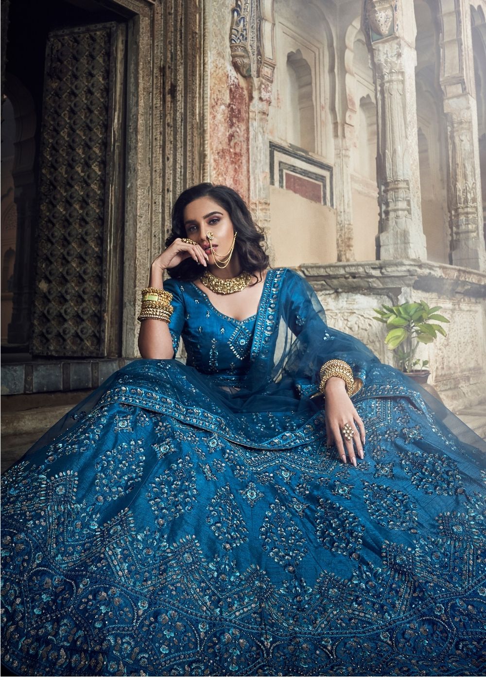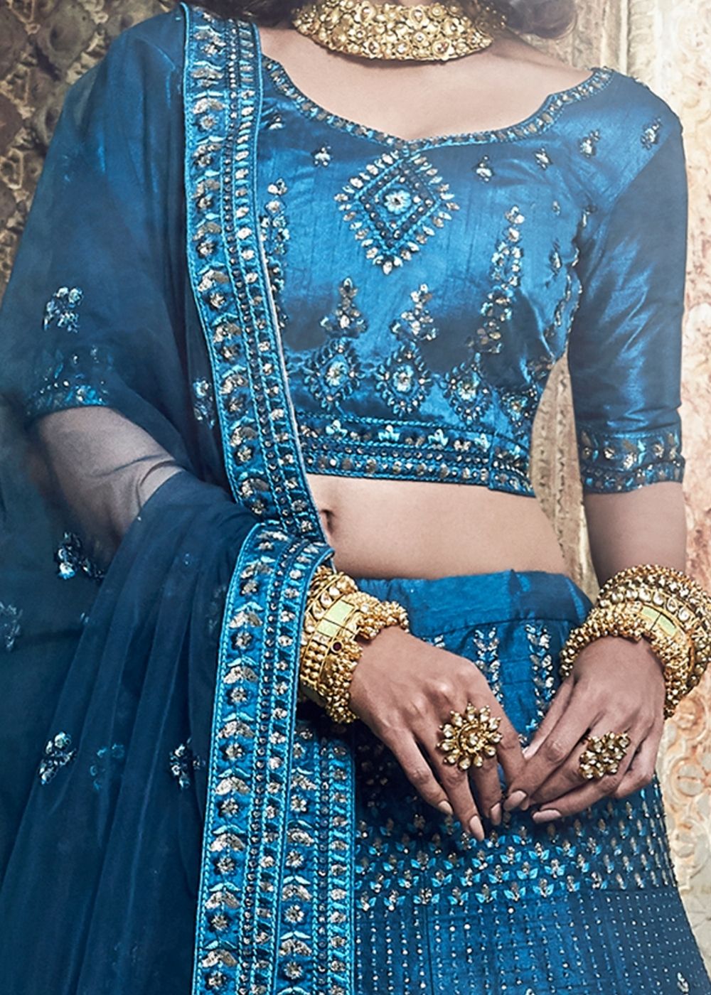 Take home an artistic ensemble of tradition and innovation with these graceful lehenga choli picks. This fascinating piece comes in art silk in shades of cobalt blue. Adorable thread, zari, sequins and zarkan work along with a matching dupatta, make it wow-worthy and give you the ultimate ethereal look.