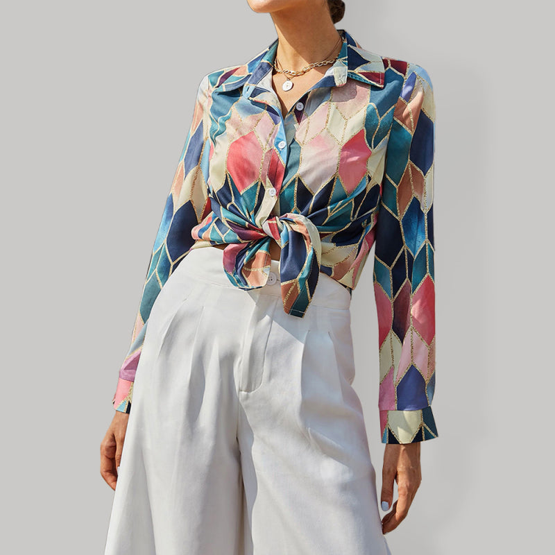 Upgrade your wardrobe with our Women's Diamond Print Button Down Blouse. This fashionable piece showcases a captivating diamond print pattern and elegant sleeves, while the intricate gold design adds a touch of glamour. Perfect for any occasion, this blouse combines style and comfort effortlessly.