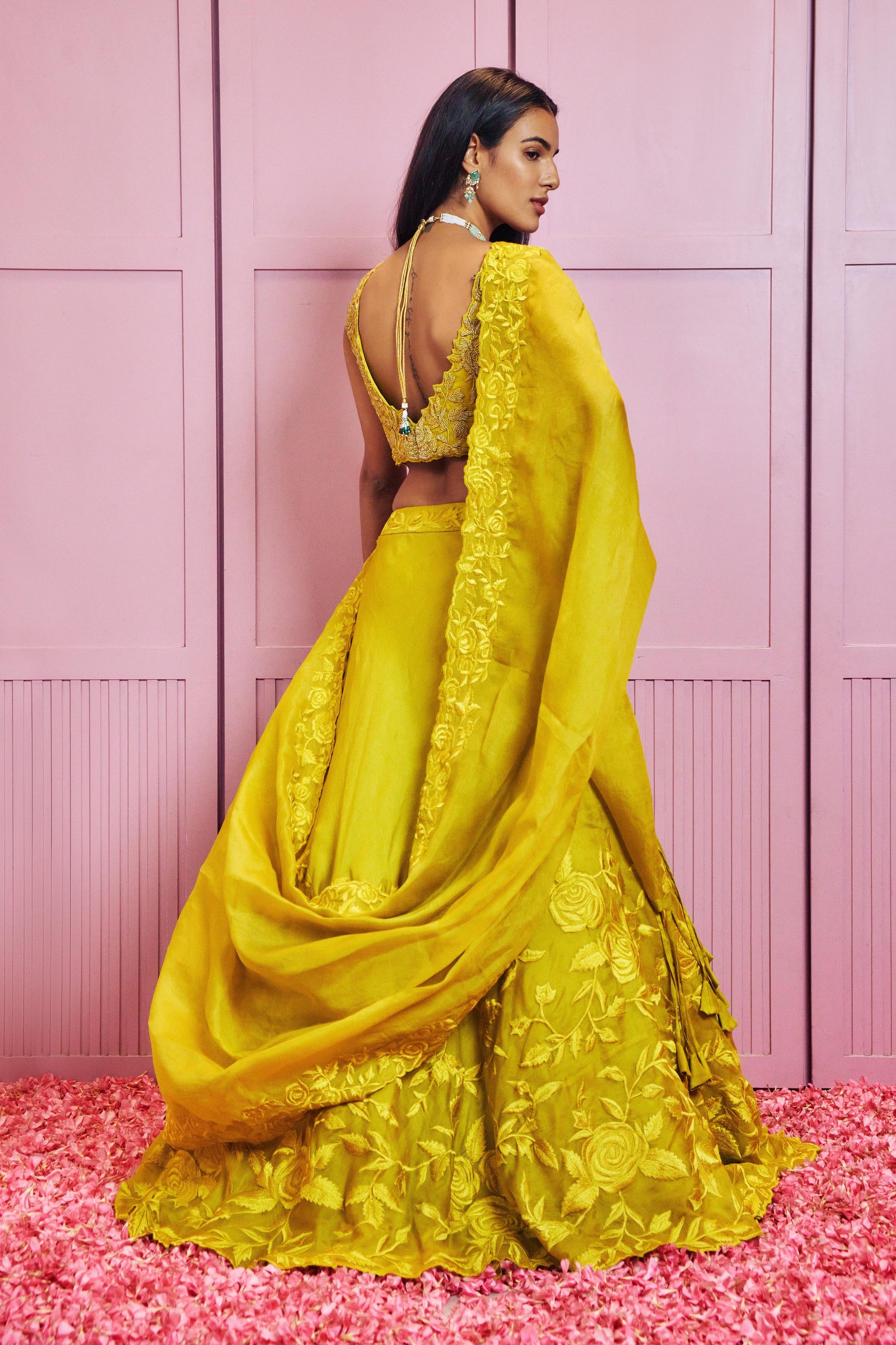 Yellow-Green silk organza floral embellished skirt paired up with hand embellished pearl blouse and organza dupatta