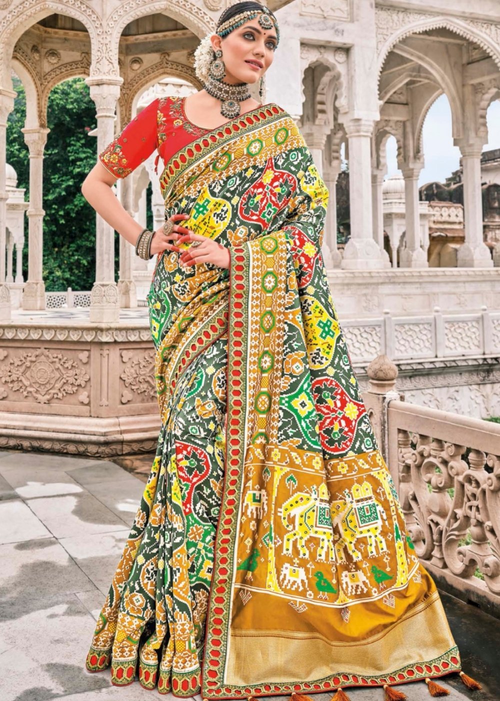 Green & Yellow Patan Patola Silk Saree with Embroidered Blouse