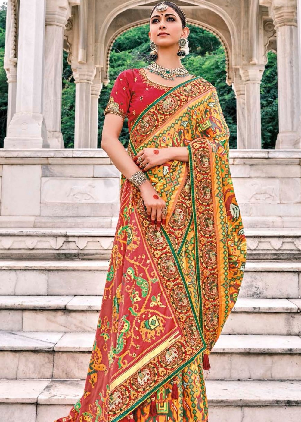 Honey Yellow Patan Patola Silk Saree with Embroidered Blouse