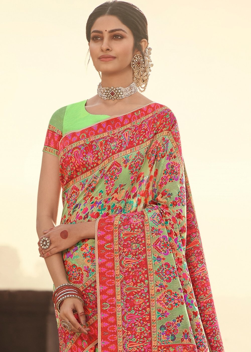 Pista Green Banarasi Kora Silk Saree with Pashmina Weaving & Zari Border Pallu