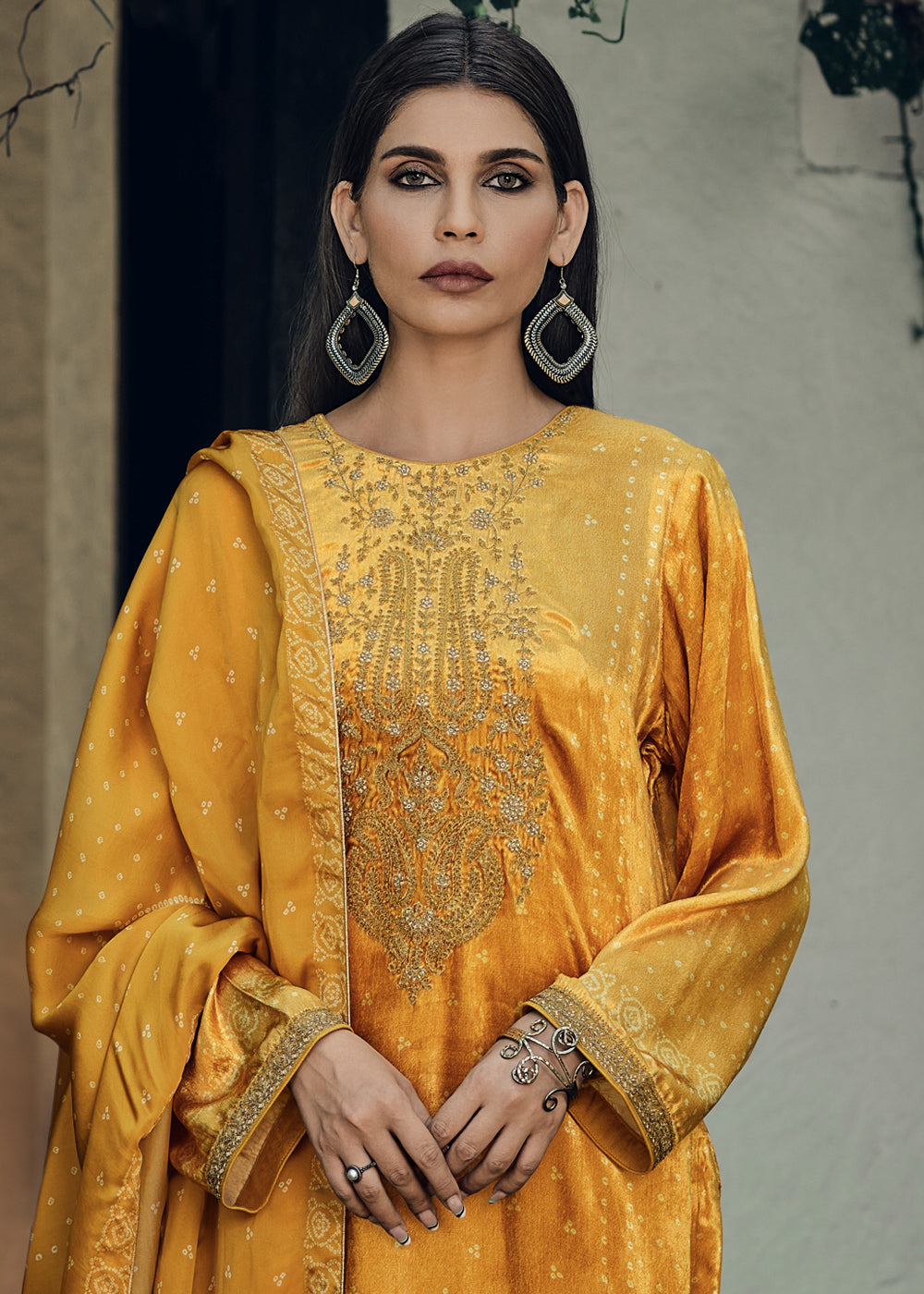 Mustard Yellow Bandhani Printed Velvet Salwar Suit With Embroidery Work