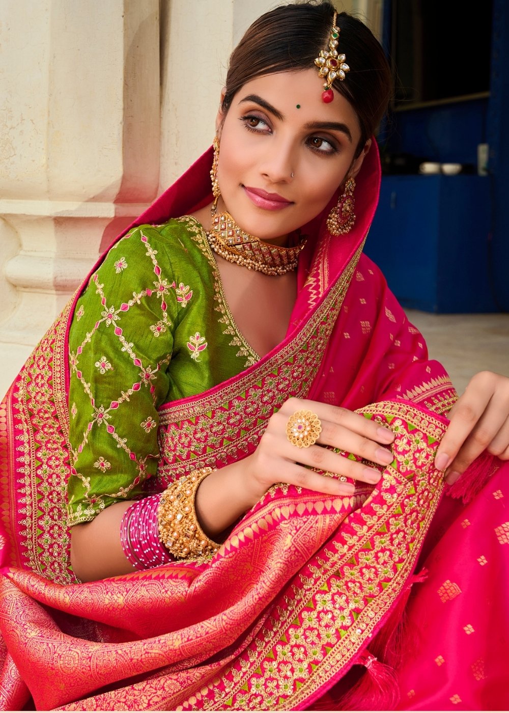 Experience trusted craftsmanship and rich quality by our weavers from Banaras with our latest collection of woven Banarasi silk sarees. A fabulous choice for weddings and grand occasions, this gorgeous beauty comes in shades of magenta pink with a light green embroidered blouse. Choose this exuberant piece and blend modernity and tradition into one.