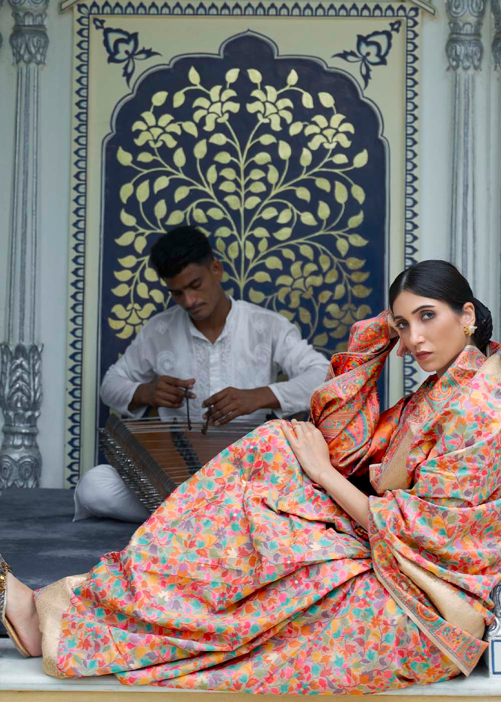 The timeless charm and melodic grace of this Banarasi Jamawar Woven Silk Saree will add a dash of perfection to your ethnic wardrobe. A resplendent rendition of Kashmiri craftwork coupled with a graceful pallu, this Beige Brown & Pink saree is luxurious in feel and elegant in appearance. Created using multiple coloured wefts, this comes with a rich design all over the run.