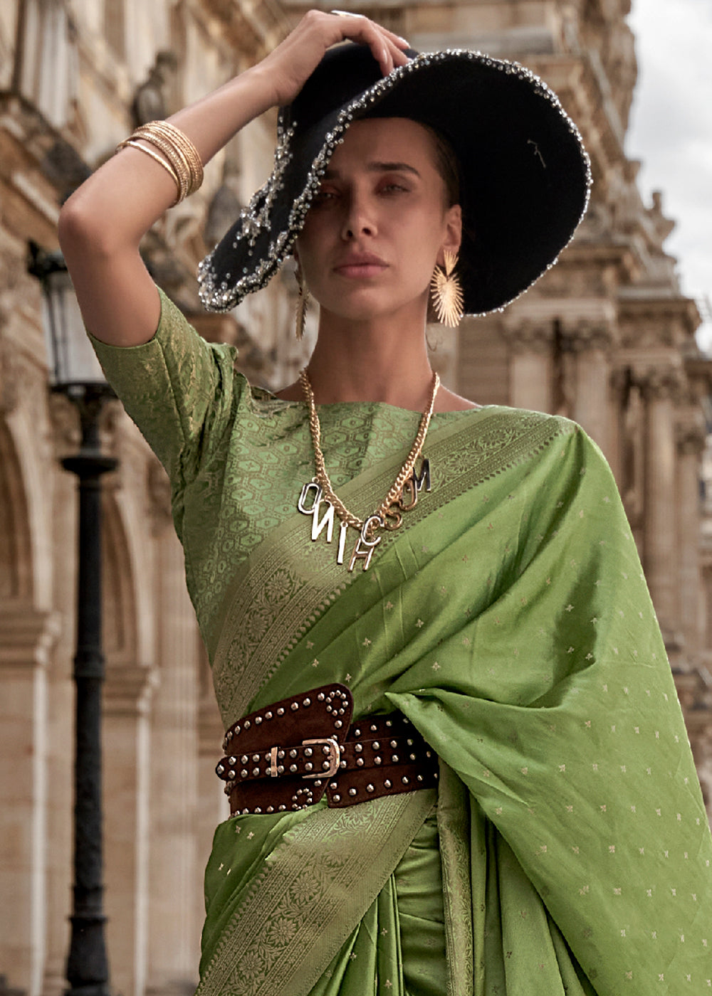 Relinquish the freshness and charm of this easy-breezy summer sorbet delight, and cherish the look! A flattering silhouette infusing an aura of sophistication with its comforting, and lightweight nature and interwoven with elegant silken yarns and handloom weaving, this vibrant and lush Cool Green toned satin silk saree is a spellbinding beauty and a trendy delight.