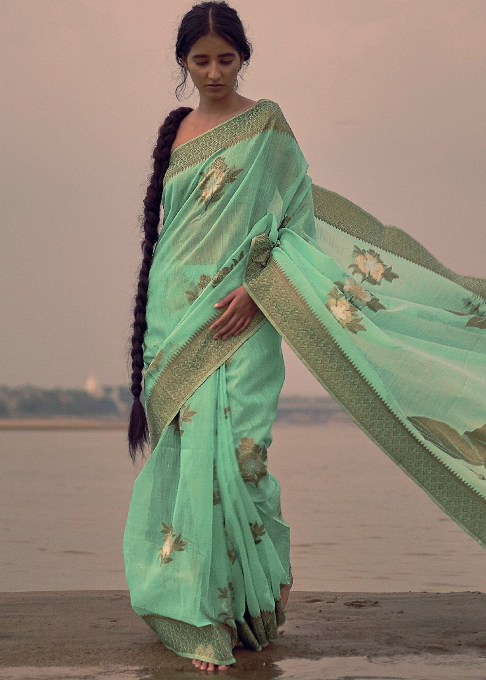 Nothing beats the joy of having stylish ethnic wear dipped in tons of comfort. Presenting the super comfy and super popular woven linen saree collection in vivid colors and enchanting patterns. This piece comes in mint green to lift your spirits and is beautified with floral motifs on the border and pallu. Weekday or a weekend, this will keep you basking in the glory of its charm.
