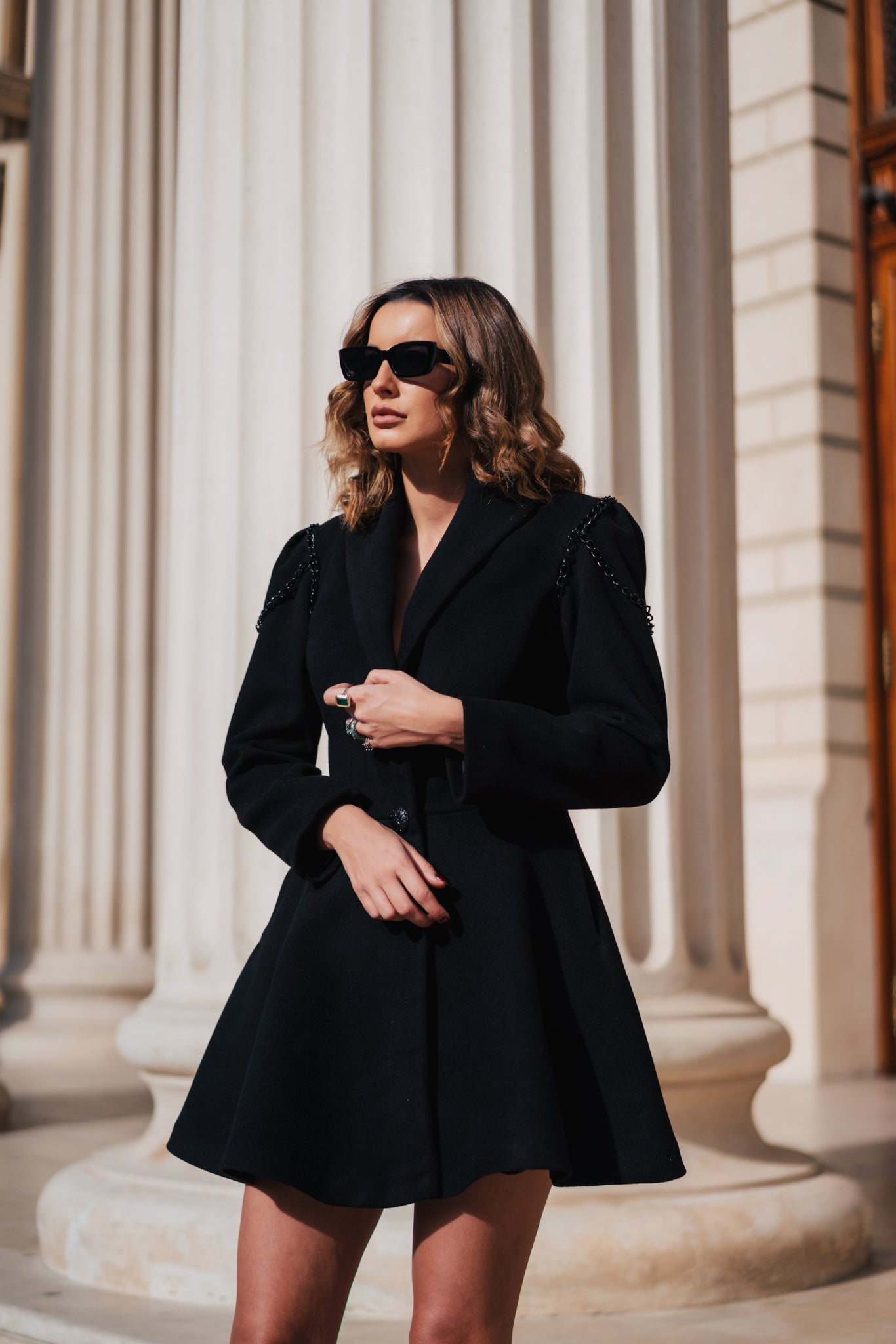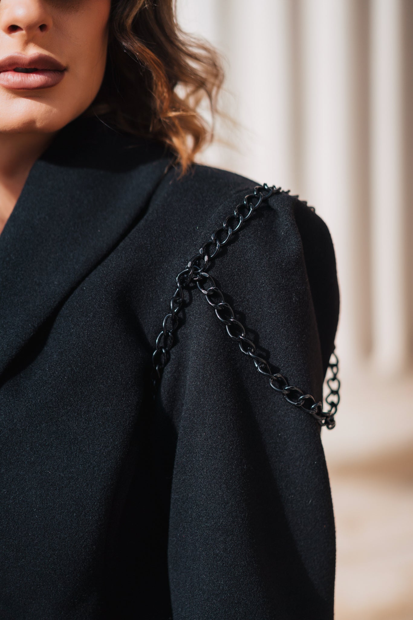 - Paltonul Irine are o croiala cu totul deosebita. Acesta se fixeaza frumos pe talie într-un nasture, în timp ce partea de jos este larga, lejera, asemenea unei fuste clo?. Mâneca u?or sus?inuta ofera un mic volum în zona umarului. Tot acolo, aceasta este accesorizata cu un lan? negru frumos, care ofera un aspect aparte ?inutei;