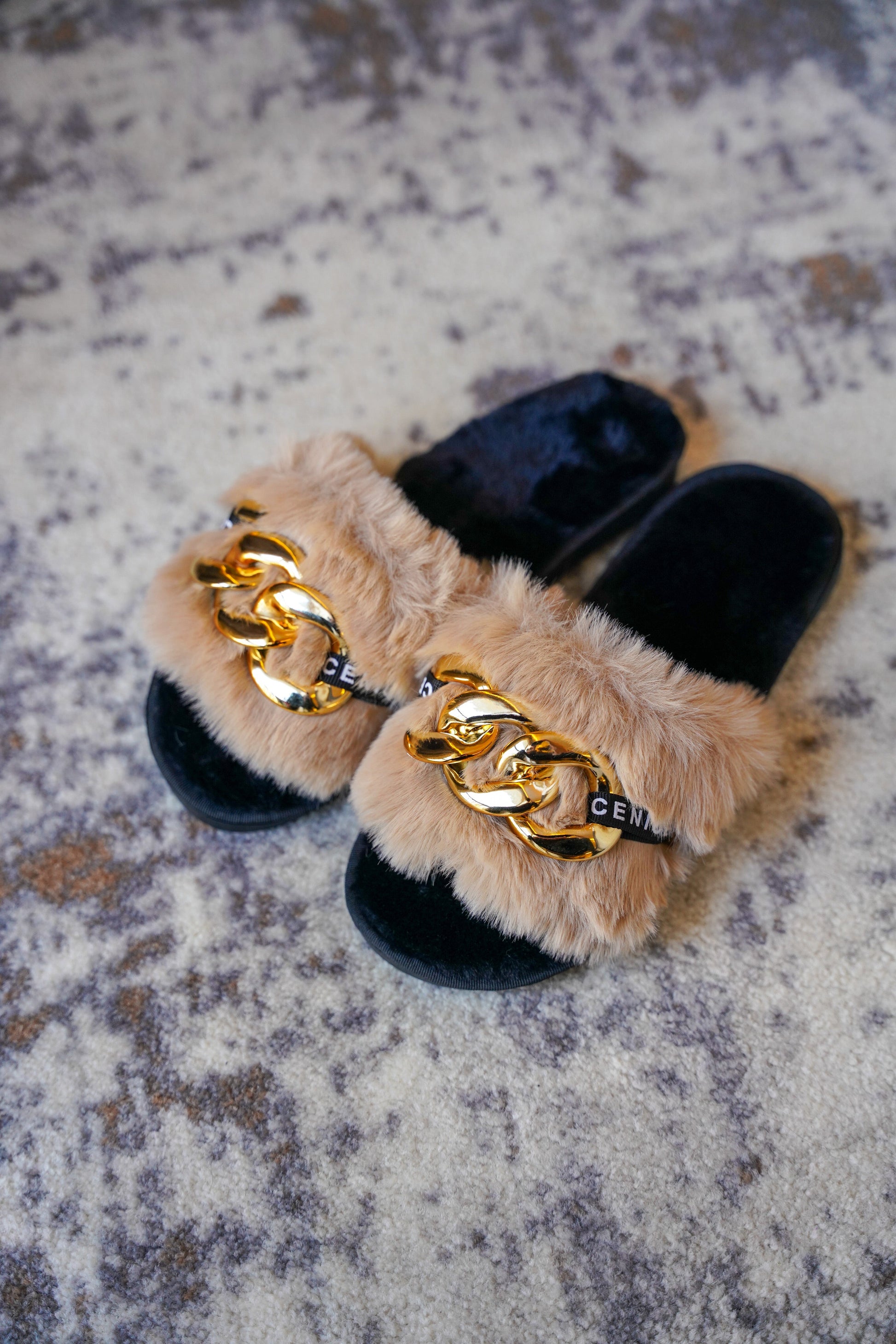 - Papucii Gia sunt o alegere perfecta daca sunte?i în cautare de o pereche de încal?ari de interior comode ?i calduroase. Ace?tia sunt decupa?i în fa?a pentru un design deosebit. Lan?ul auriu este unul calitativ care întrege?te aspectul deosebit al papucilor;