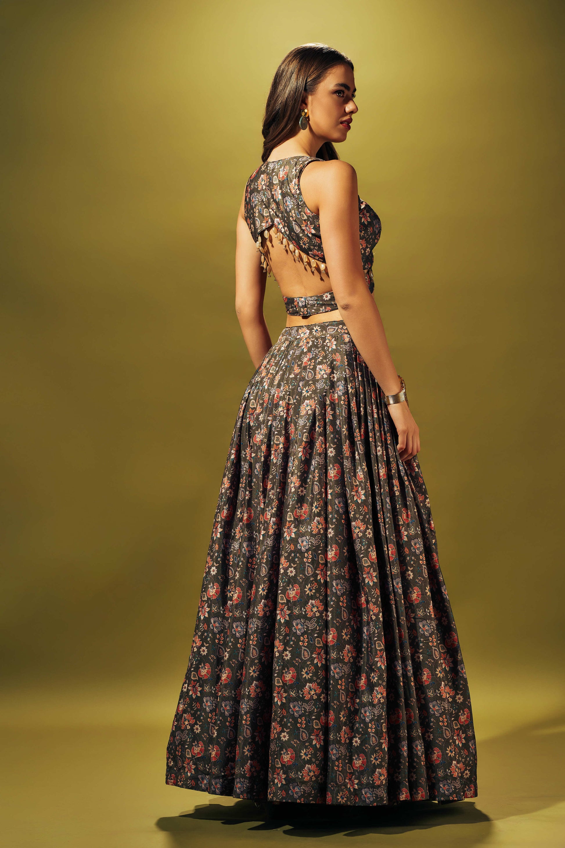 Olive green floral printed skirt in crepe silk paired up with matching overlapping blouse embellished with stones