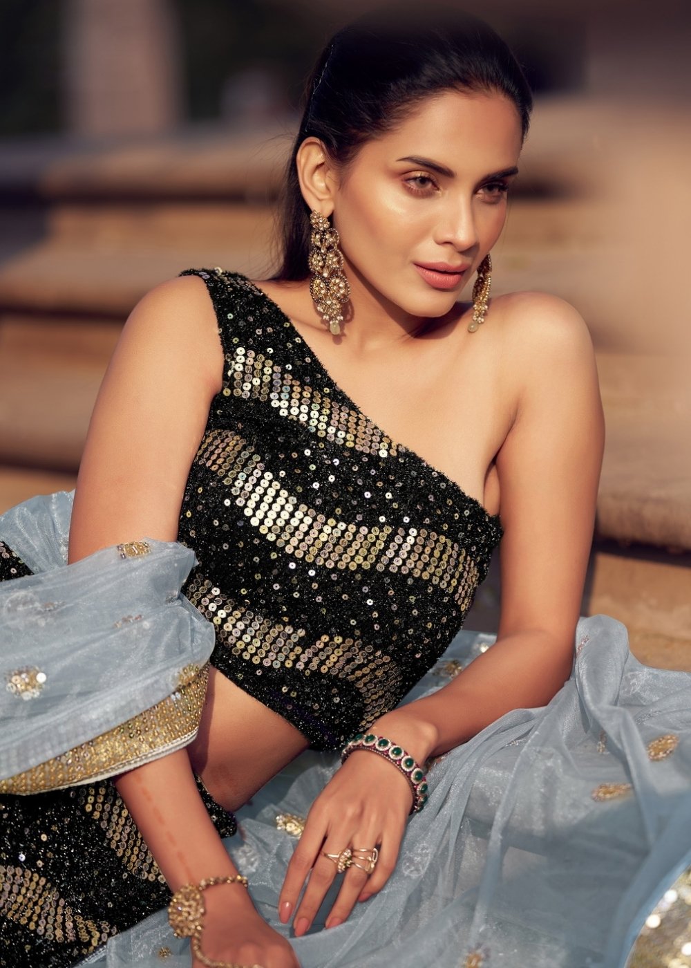 Steal the spotlight with this black and grey designer lehenga choli decked with sequins work to create a masterpiece. Super comfortable to carry and with a high appeal, this lehenga with a striped design is a perfect choice for parties and functions. Pair this with trendy accessories and slay like a diva.