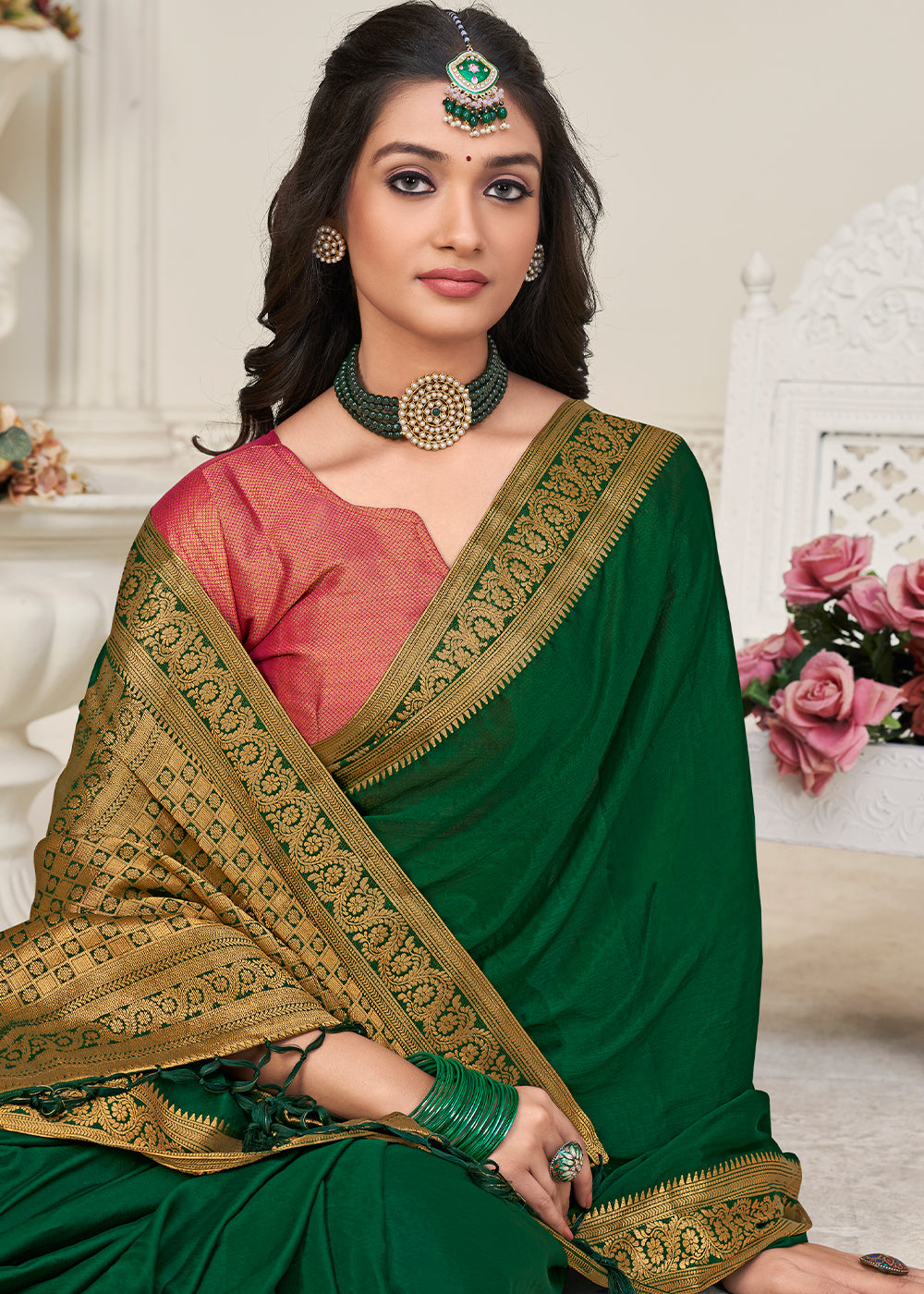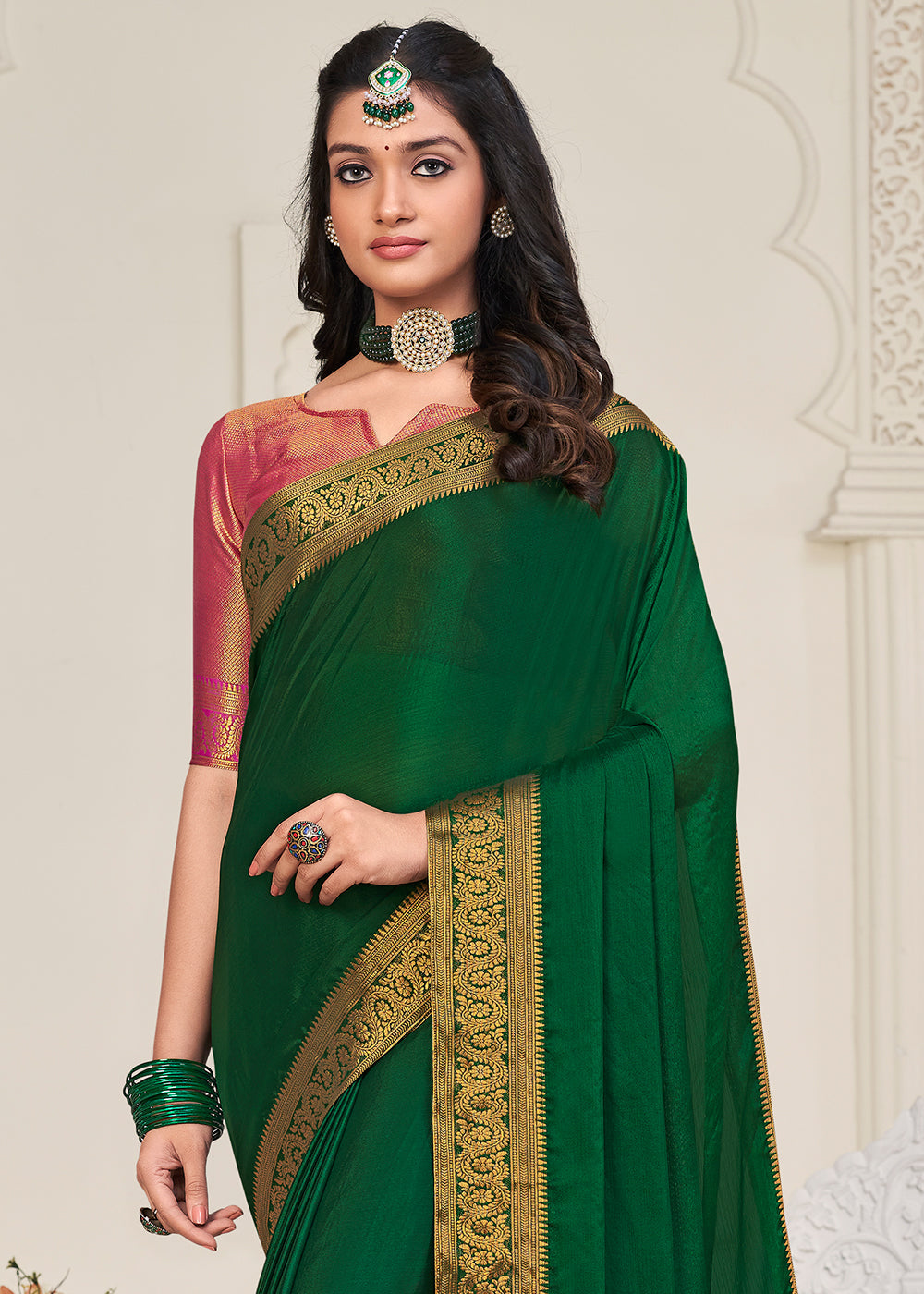 Choose from our rich and vibrant palette of elegant Chinon silk sarees and take home a fine balance between traditional and modern styles. Adored for their smooth and shiny texture, these sarees add a touch of sophistication to the wearer's persona. Pick this Castleton Green saree and complement your look with traditional jewellery to garner compliments.