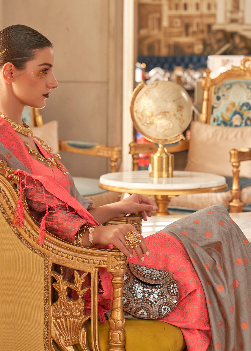 Grey & Pink Bamboo Copper Zari Handloom Woven Silk Saree
