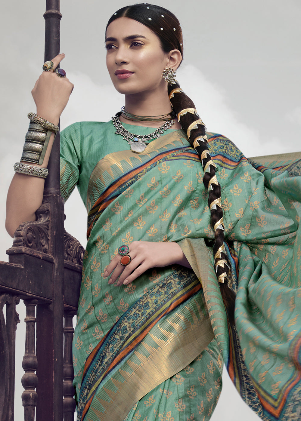 Jade Green Printed Designer Silk Saree with Weaving Border