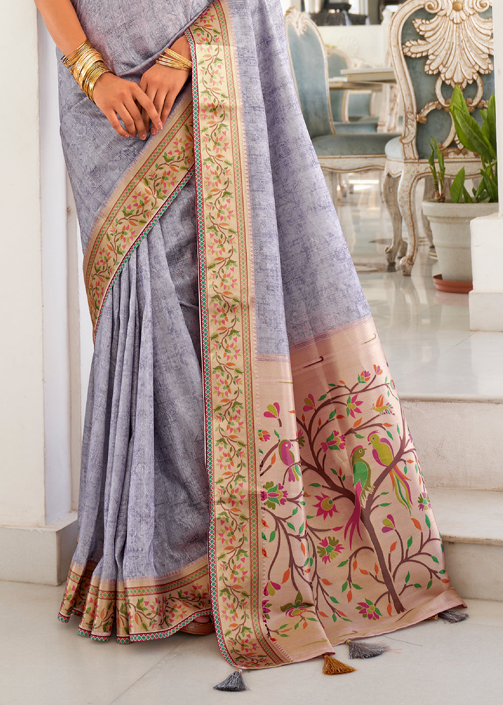 Light Lilac Purple Digital Printed Self Jacquard Silk Saree