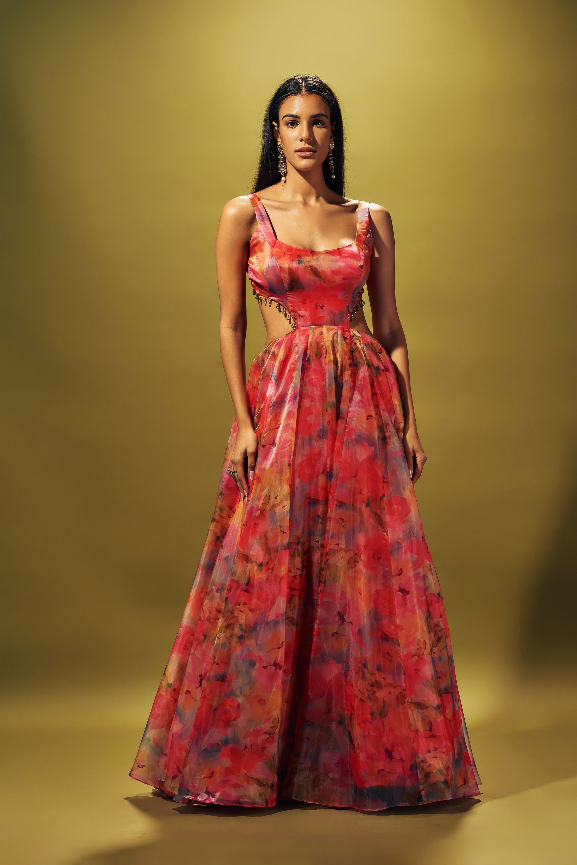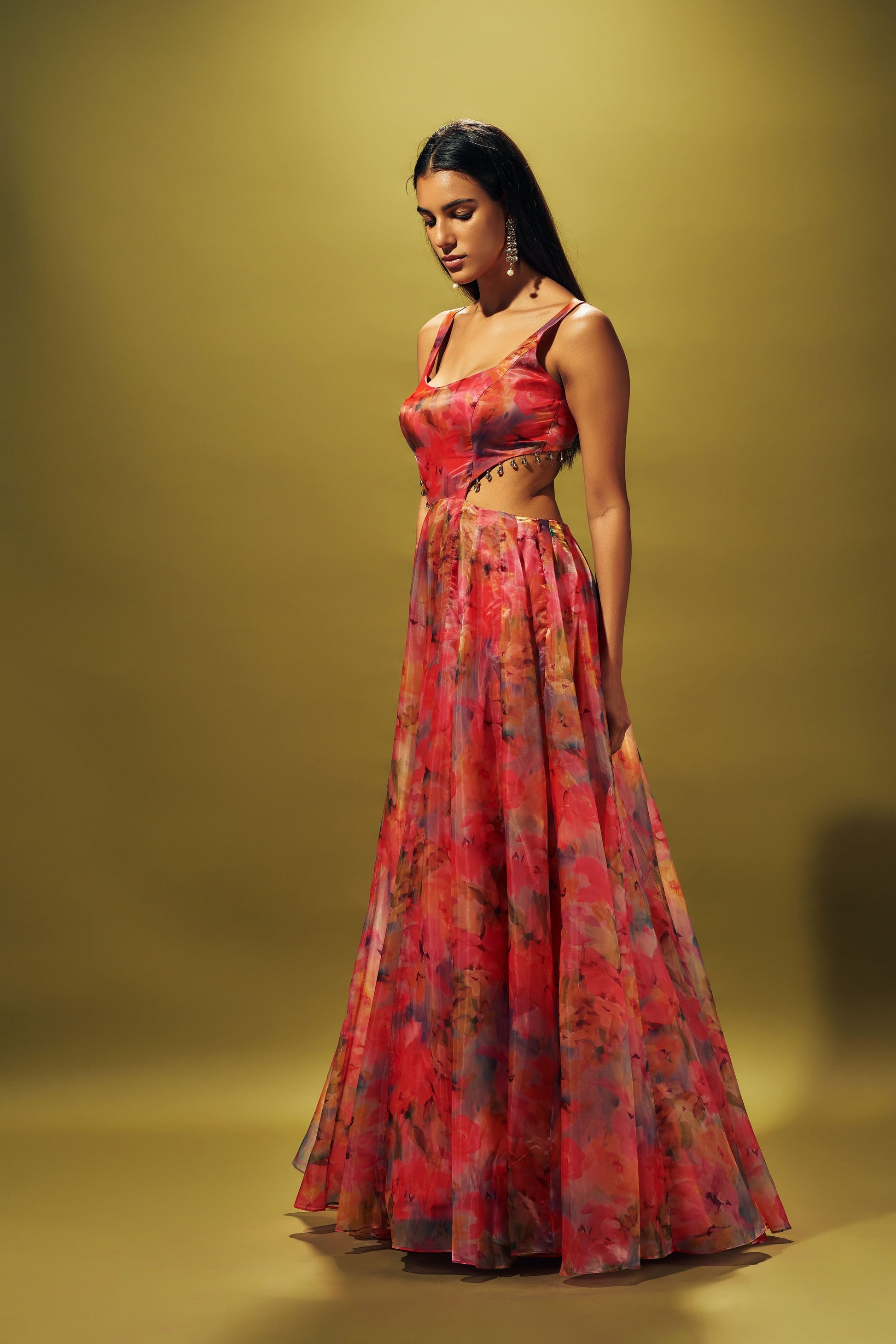 Multi color gown in liquid organza with side cuts
