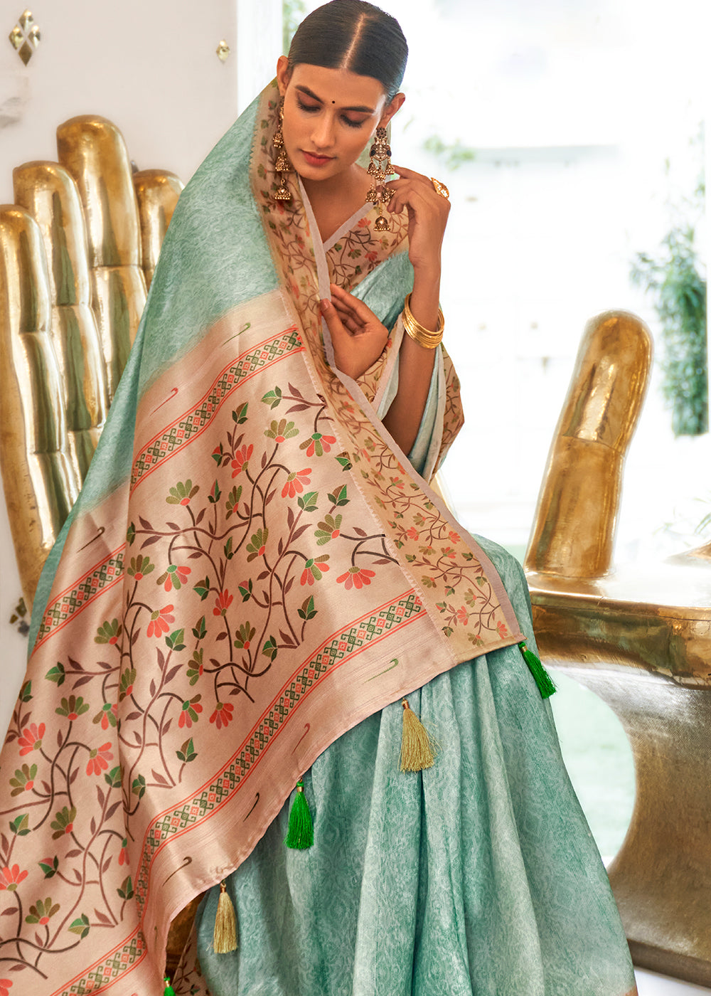 Pale Turquoise Green Digital Printed Self Jacquard Silk Saree
