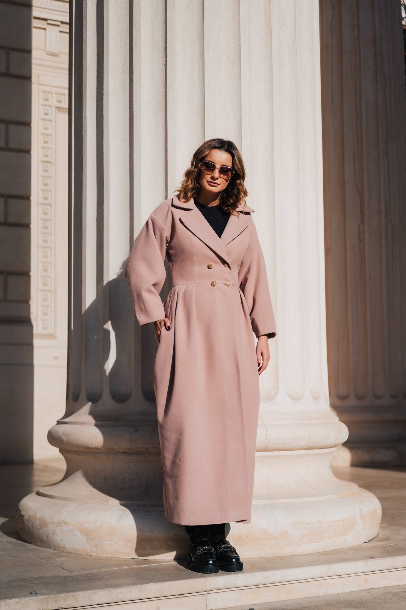 - Paltonul are o croiala eleganta. Acesta se aseamana foarte mult unei rochii. Nasturii aurii îi ofera o elegan?a fina, în timp ce mâneca supradimensionata scoate ?inuta din zona clasica;