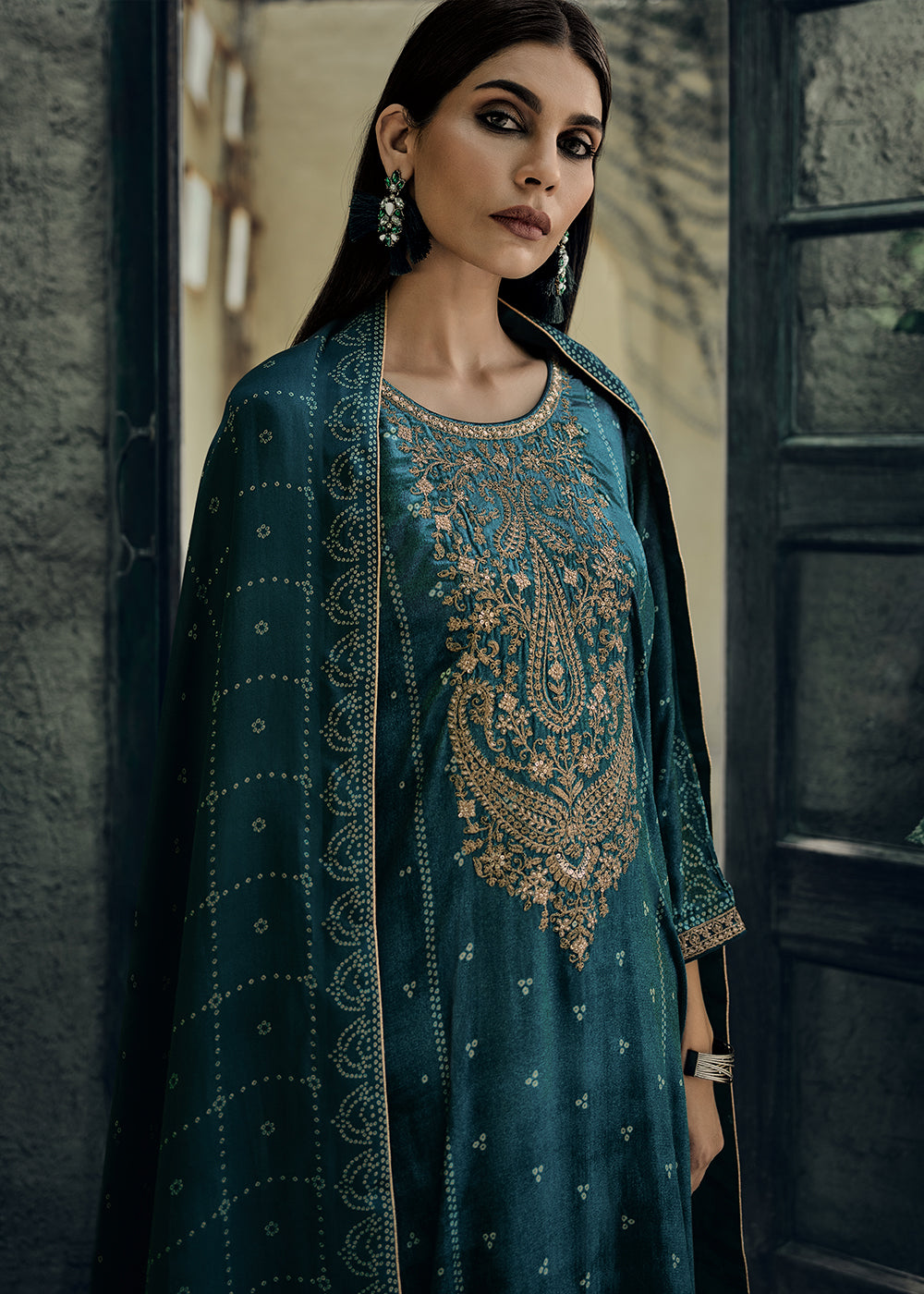 Prussian Blue Bandhani Printed Velvet Salwar Suit With Embroidery Work