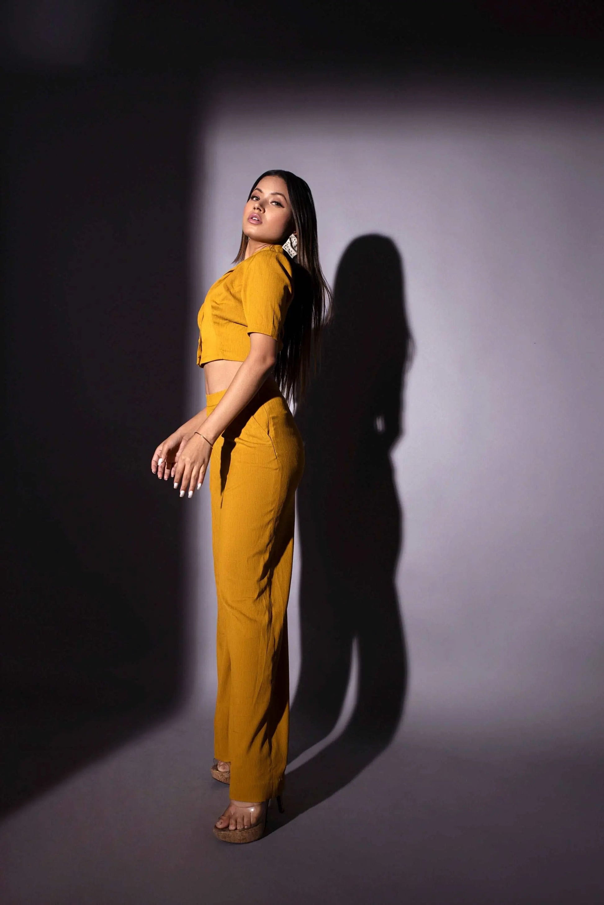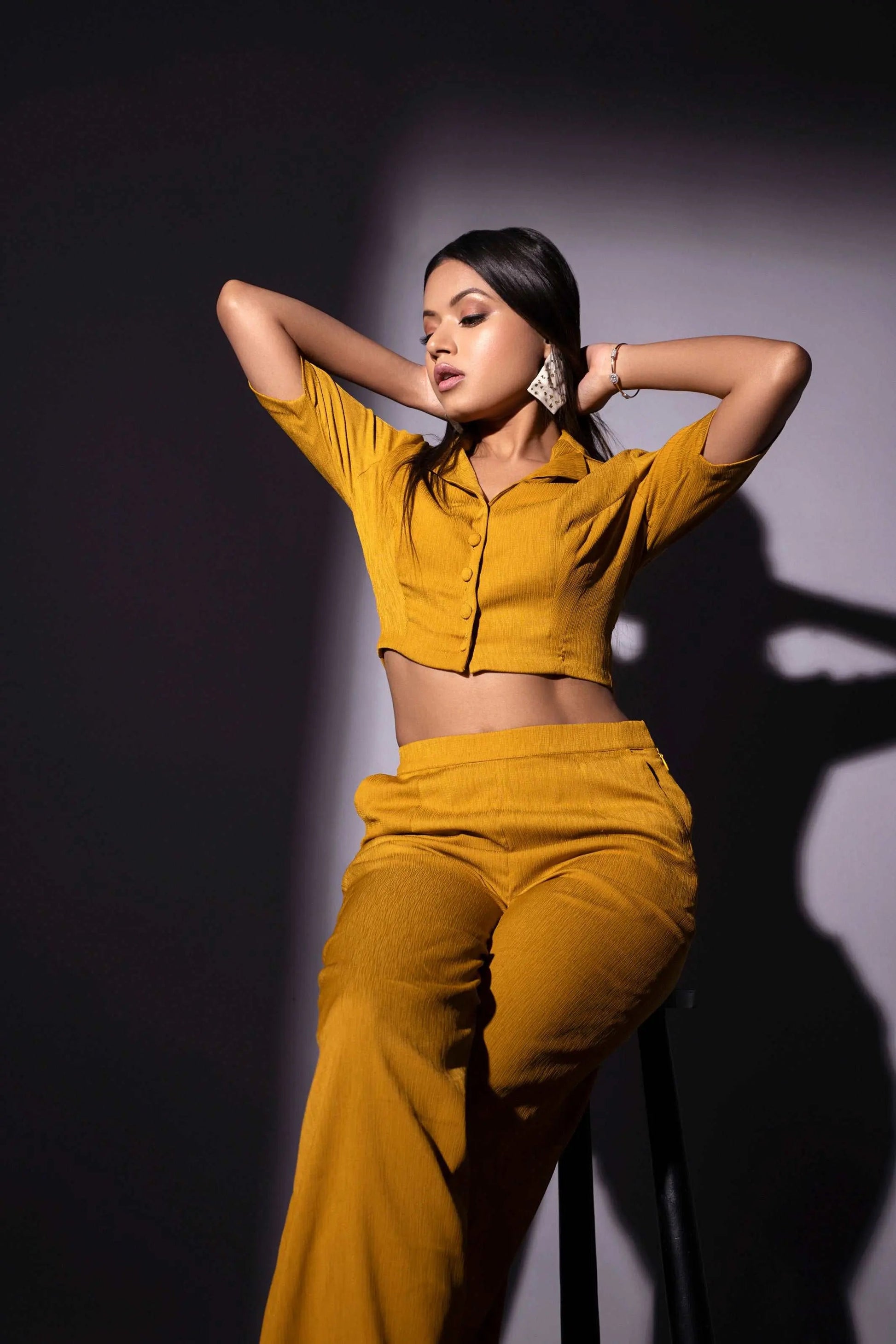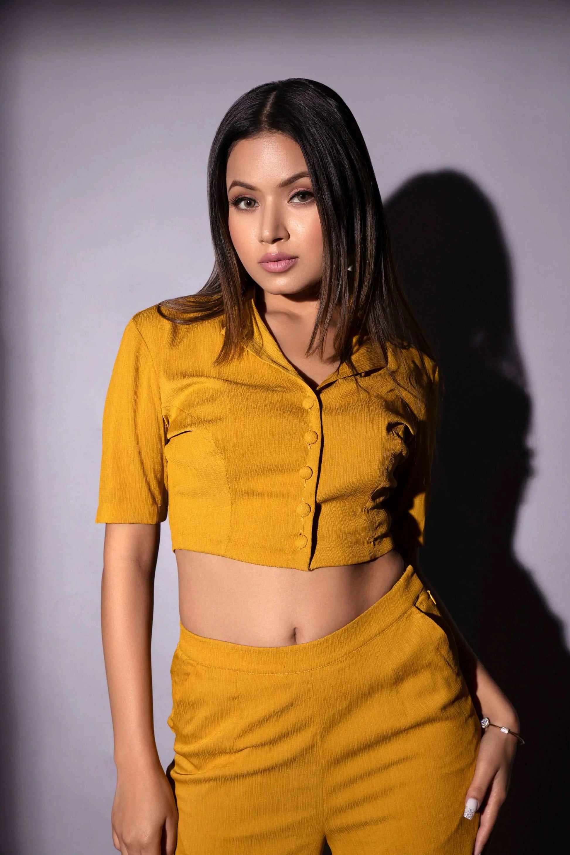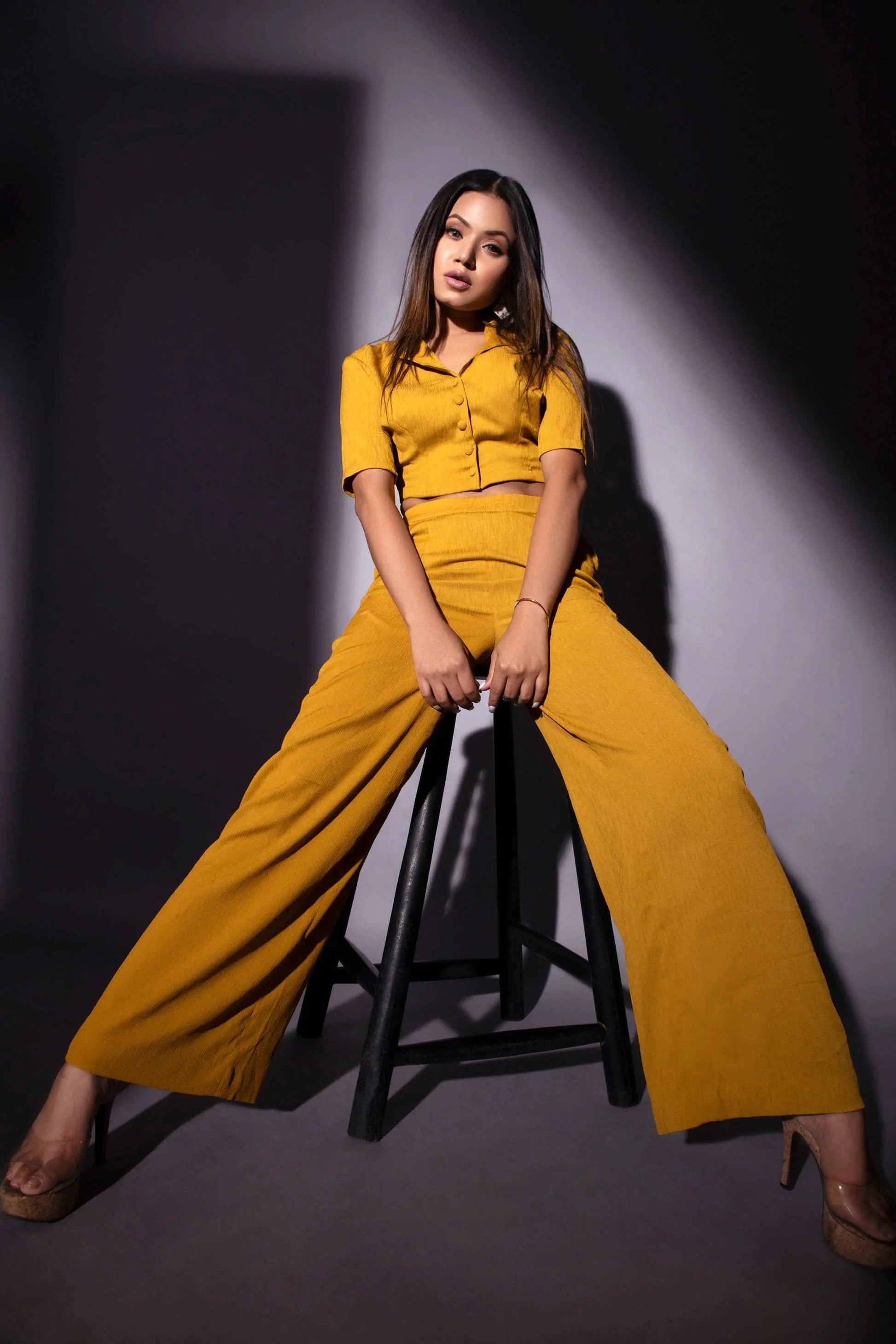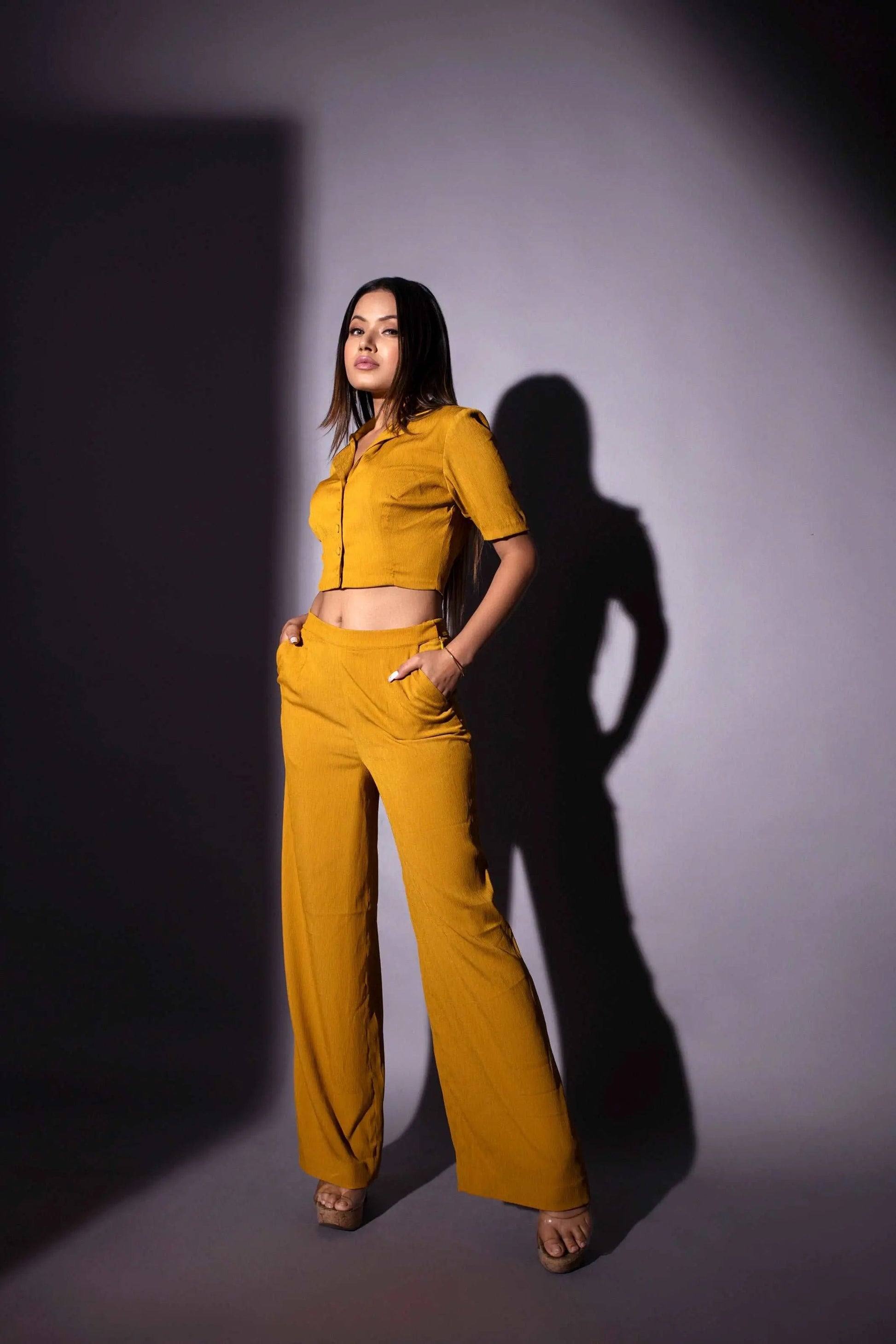 Very smart crape fabric cort set in mustard color for casual outings.