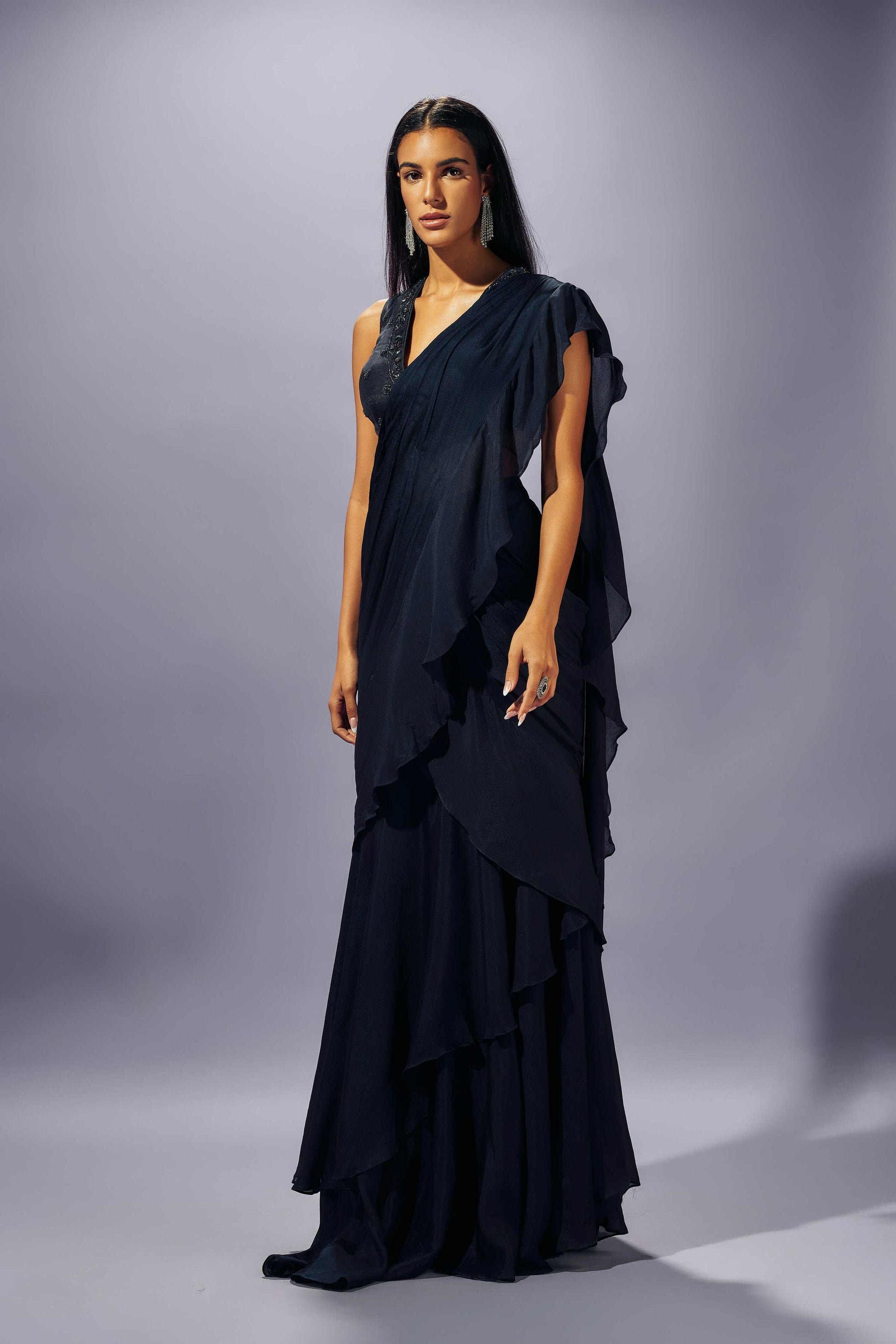 Navy blue stitched ruffle saree