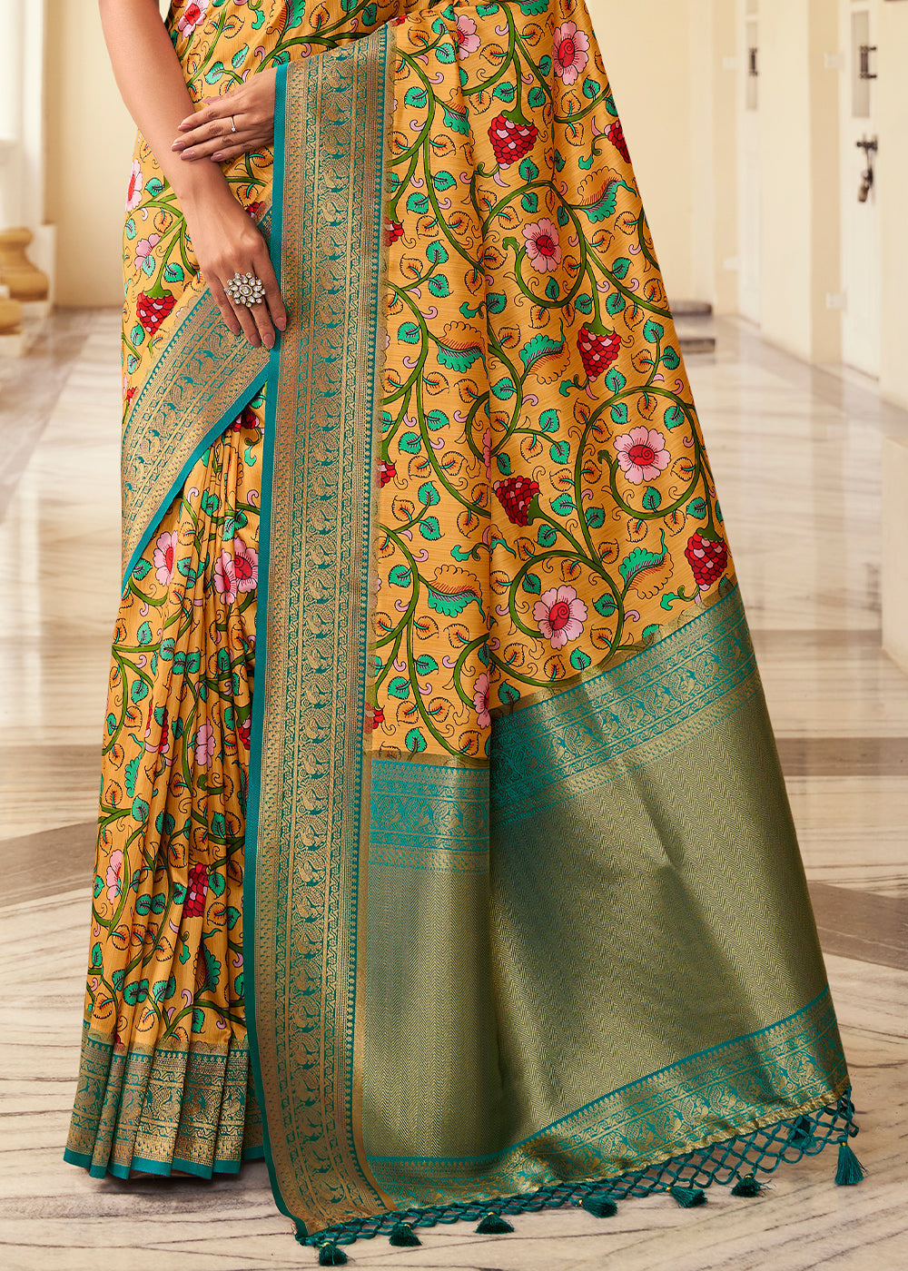 Saffron Yellow Digital Printed Silk Saree with Weaving Border & Rich Pallu