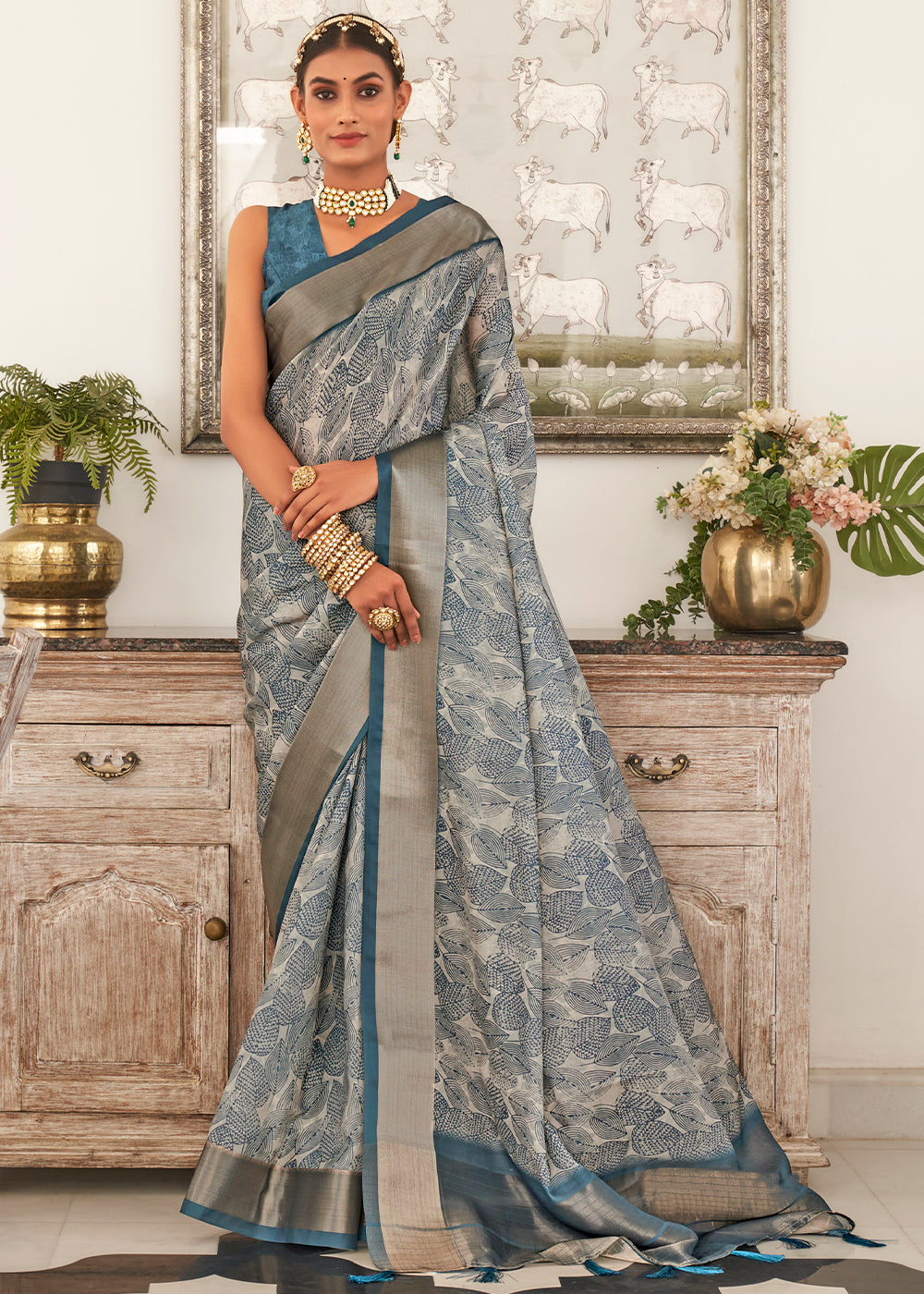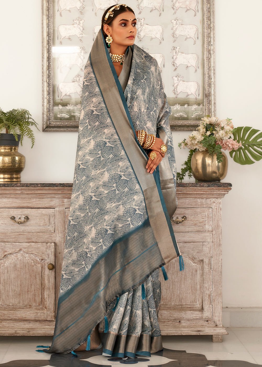 For those who appreciate a bold and modern take on traditional attires, our latest collection of Dola silk sarees is here to slay. This enchanting saree in Shades of Blue depicts the essence of your personality. Elaborately beautified with digital print, this is a great pick to showcase your vehement sense of style.