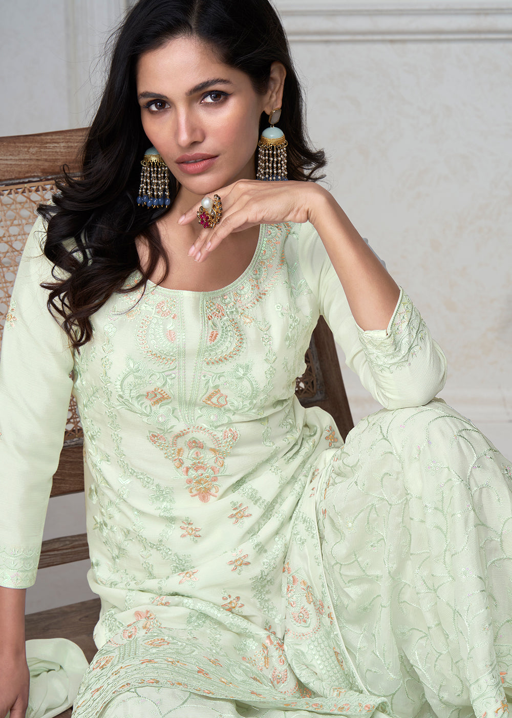 Tea Green Embroidered Chinon Silk Plazzo Suit