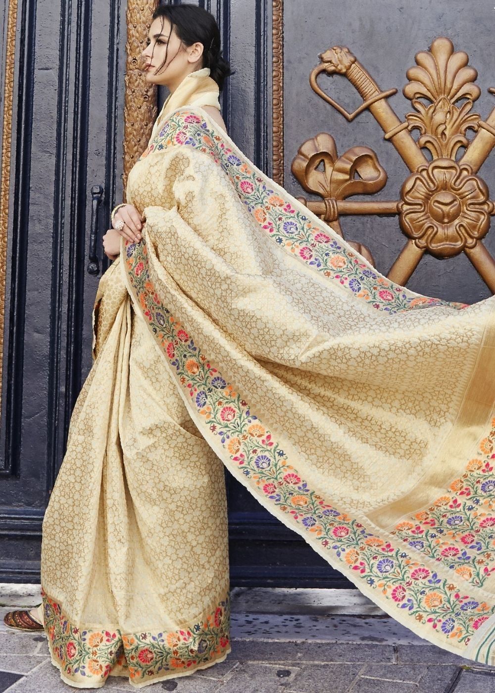 Cream and Golden Blend Silk Saree with Floral Woven Border and Pallu