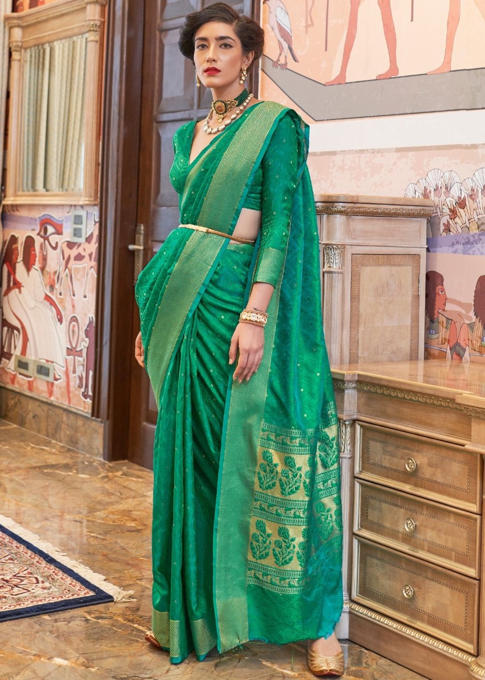 A golden treasure of every woman's wardrobe, Kanjivaram sarees are an artistic masterpiece from Kancheepuram in Tamil Nadu, India. This ultra-soft beauty comes in shades of emerald green. Soaked in the bounty of rich colors and incredible designs, it has a delightful zari border and Pallu design to add glamour to your saree collection.