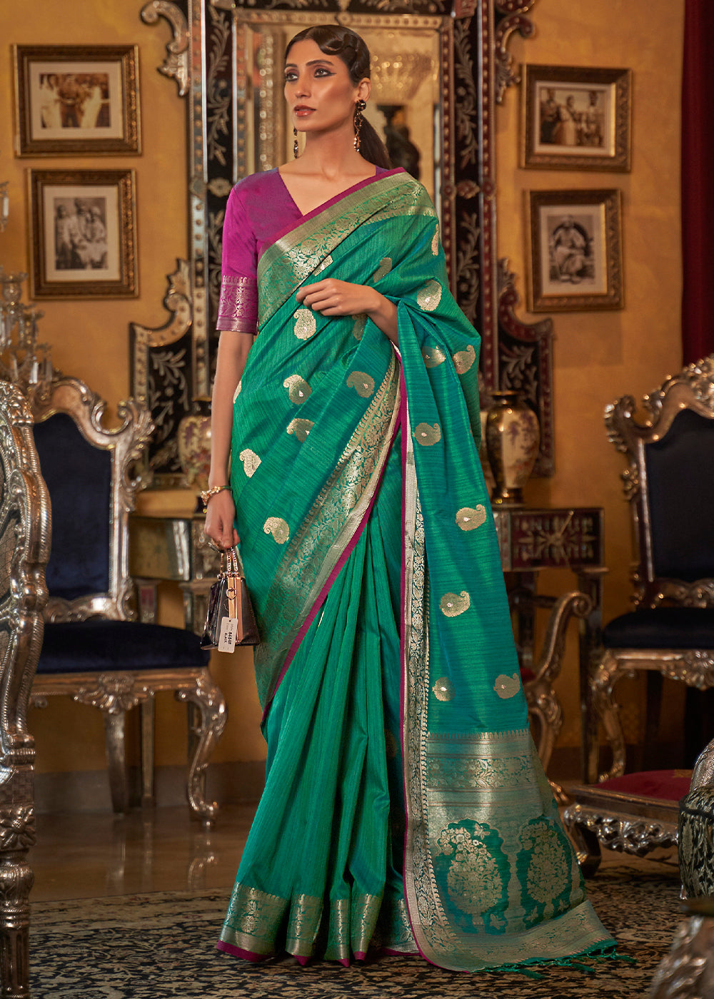 Here comes a perfect drape to wallow in the contemporary grace and add a dash of panache to your closet! This Jade Green Zari Woven Tussar Silk Saree with a contrasting magenta blouse carries the best of both vintage and modish charms. Golden Butti all over and an intricately done Pallu design makes it a drool-worthy choice.