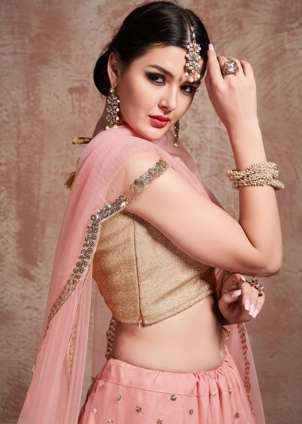 Presenting this modish designer baby pink party wear soft net fully flared lehenga with choli entangled with heavy sequins work and elegant zari work. This gives this piece with a contrasting beige choli a stylish look. Wear it with a broad smile and minimal jewellery to bring out the best in you.